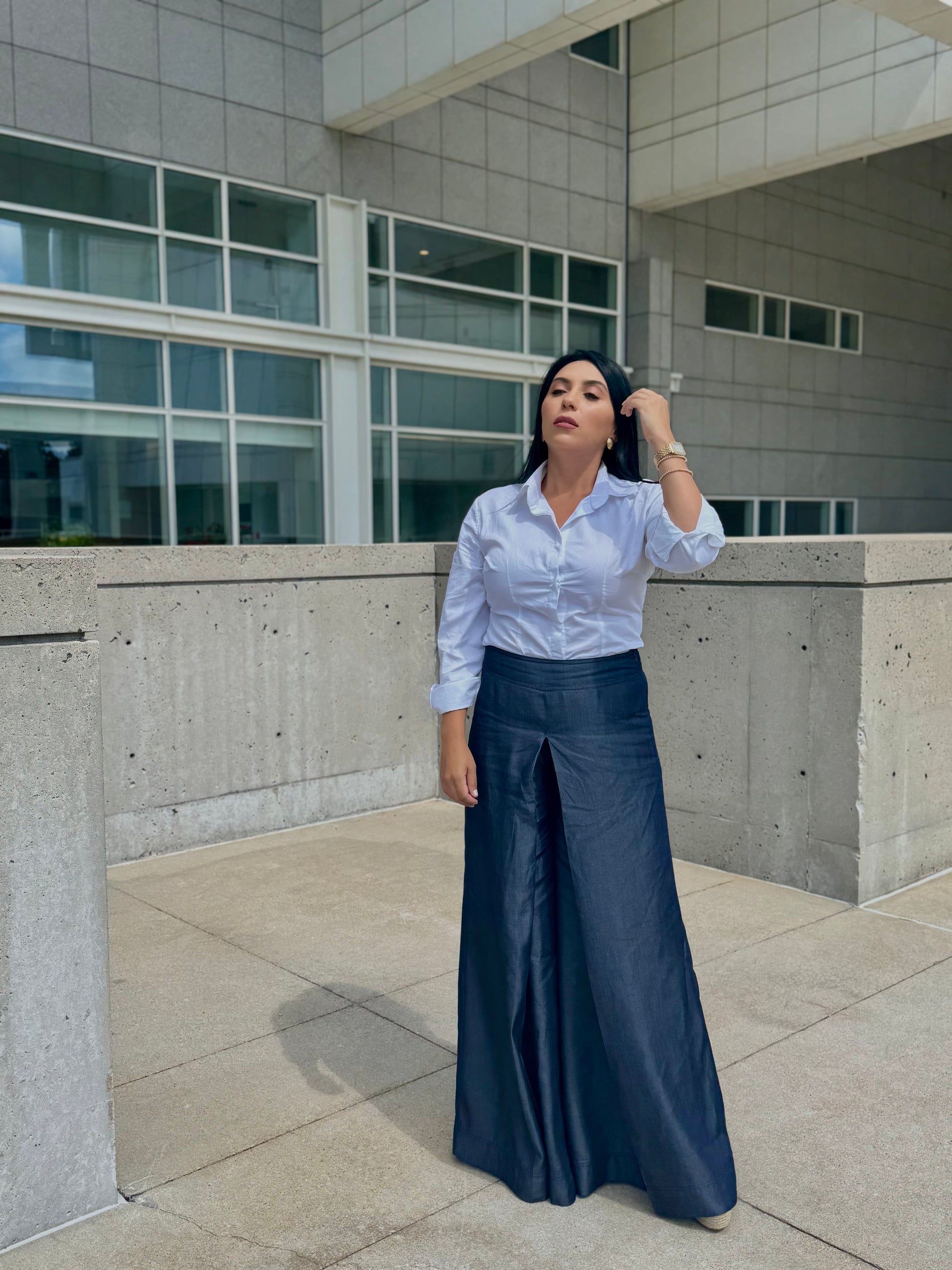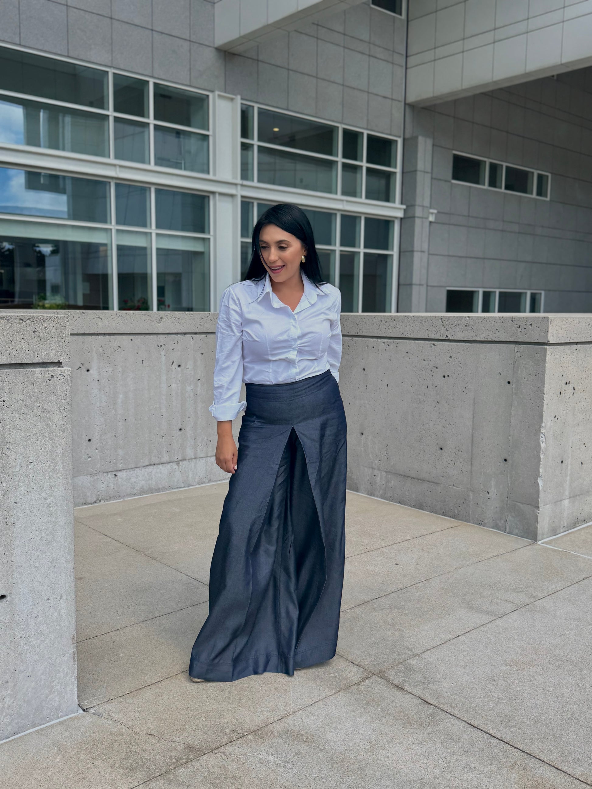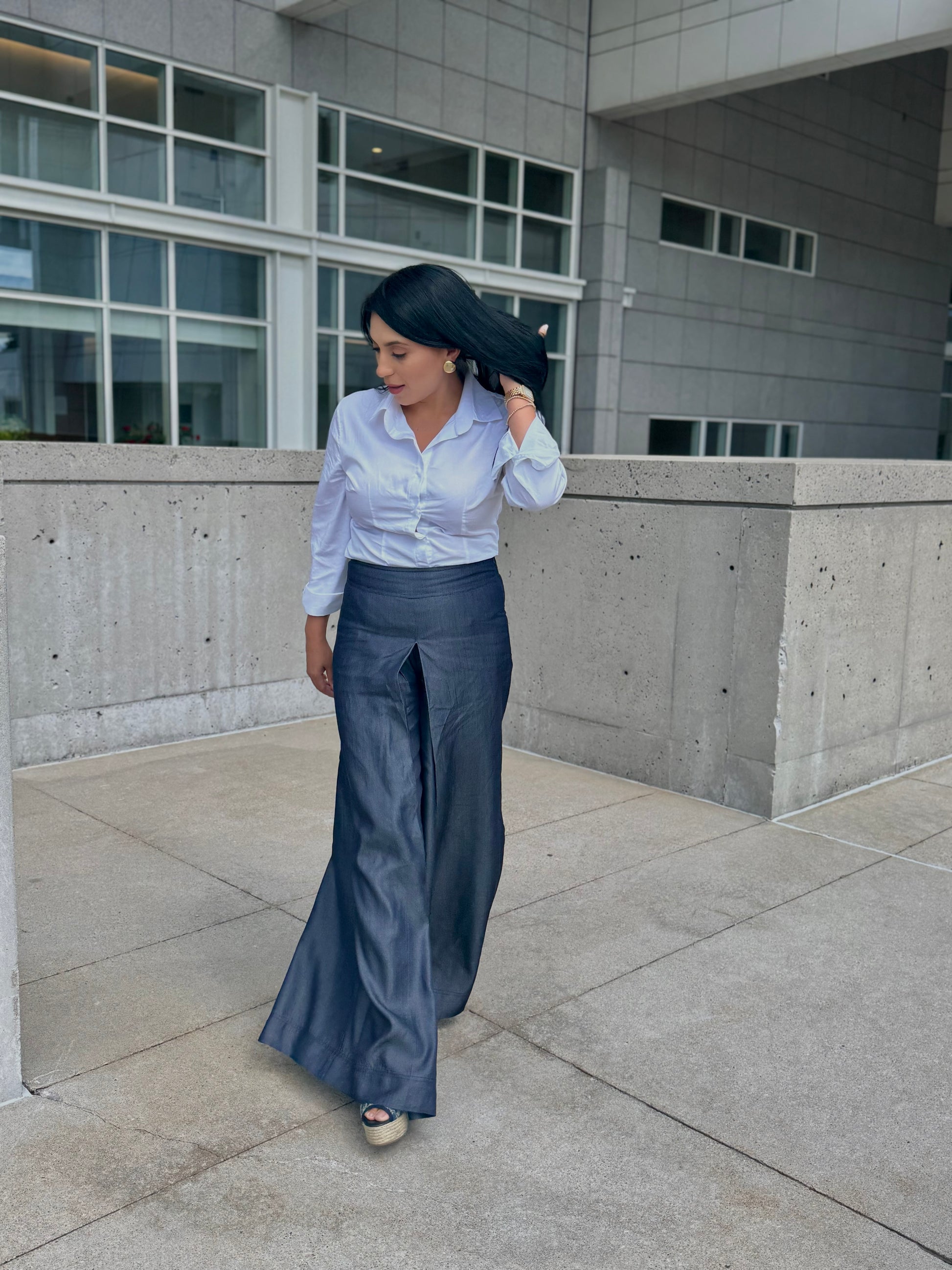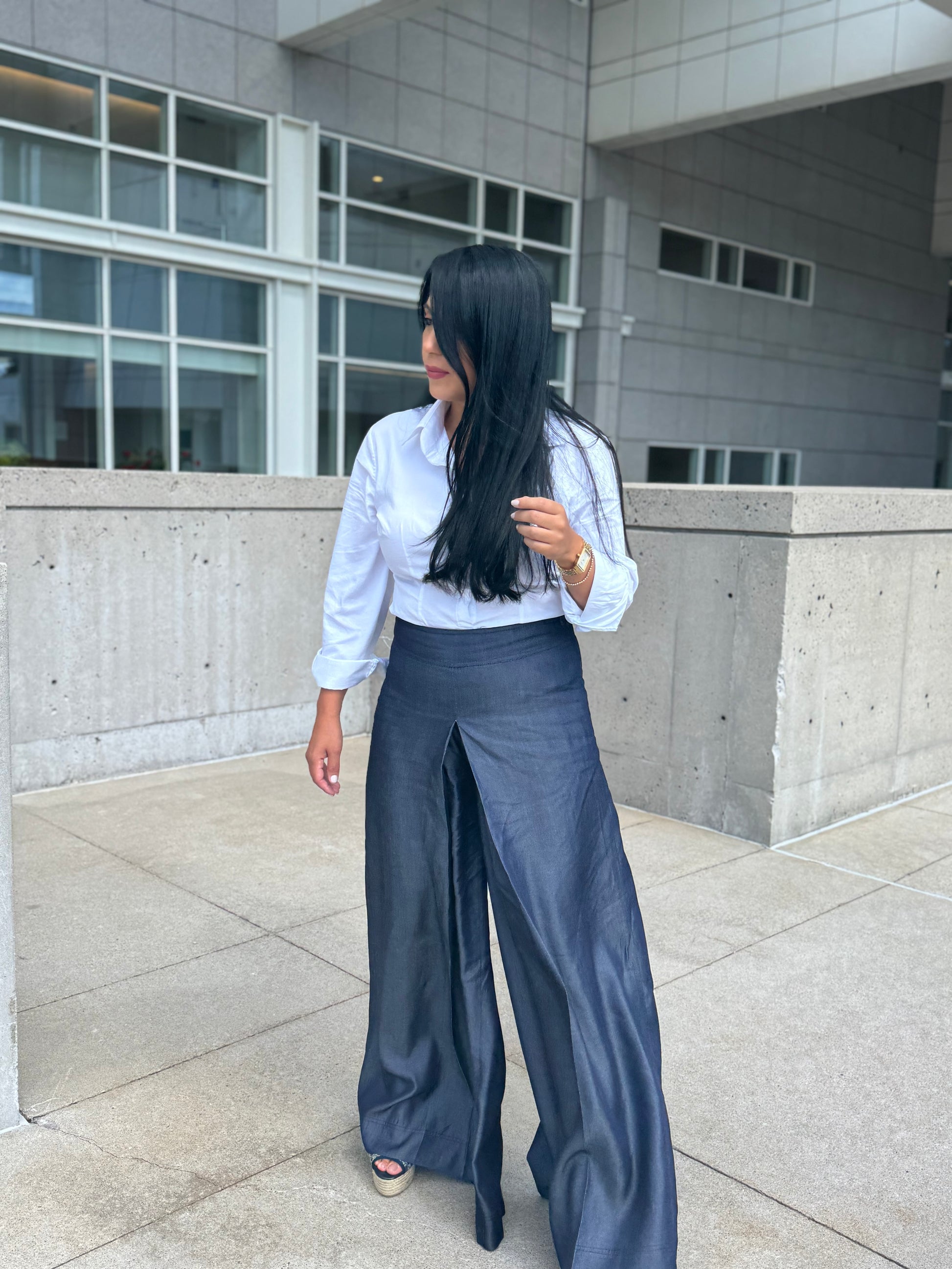 Where effortless style meets elevated comfort. These palazzo pants, crafted from 100% cotton with a fluid Tencel touch, offer the soft, airy drape of chambray denim while delivering all-day breathability. Designed to move like a skirt, the wide-leg silhouette creates a graceful flow with every step. A thoughtfully detailed front panel adds structure and sophistication, making this piece a refined essential for everyday wear. Whether styled casually or dressed up, this piece embodies quiet luxury with ease and elegance.
